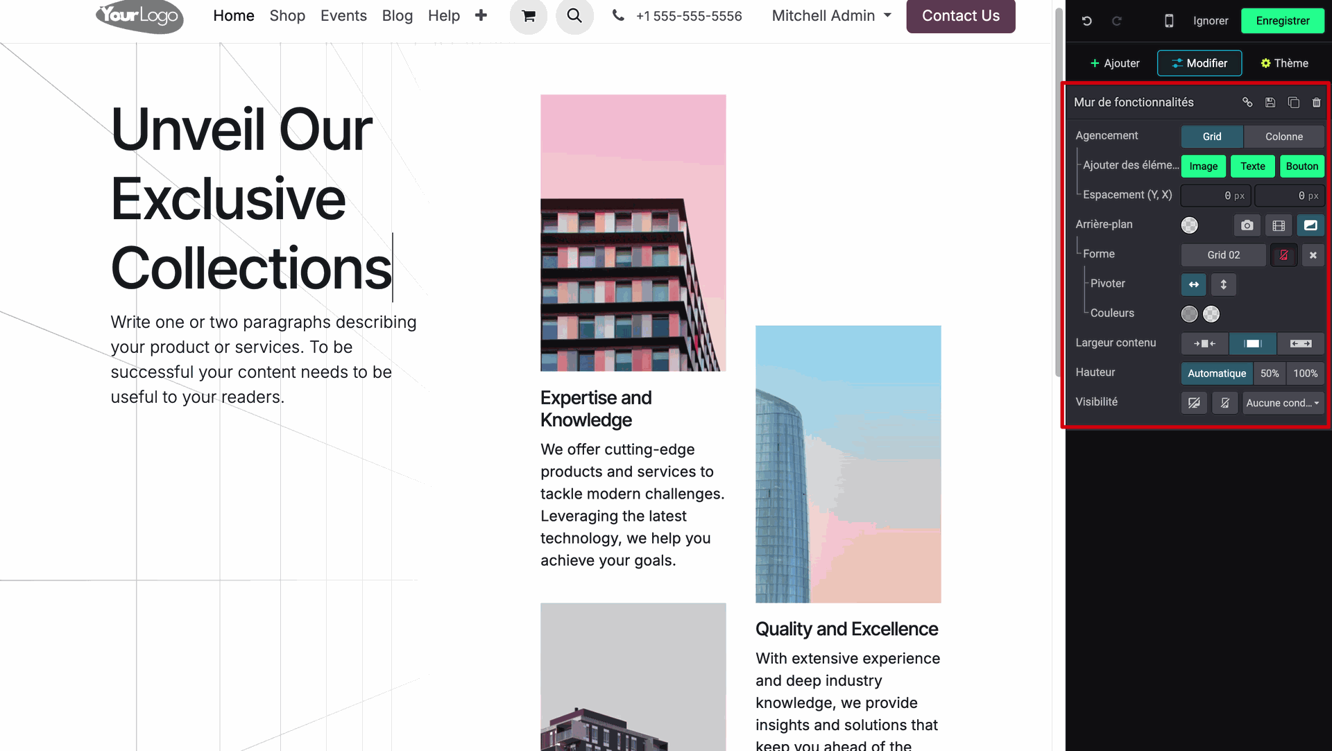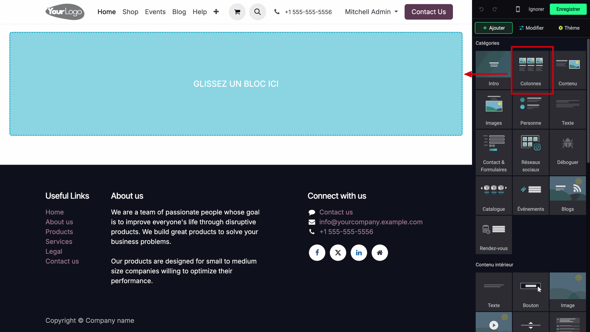 L'un des plus grands points forts d'Odoo est la fluidité de sa prise en main (vous en conviendrez, n'est-ce pas ?). Les différents postes qui auraient pu nécessiter des connaissances en développement pour un rendu satisfaisant de votre création sont simplifiés à l'aide des modules Odoo. Ces modules fonctionnent avec un catalogue de modèles à réadapter à votre guise et un système de blocs à placer et déplacer où bon vous semble.