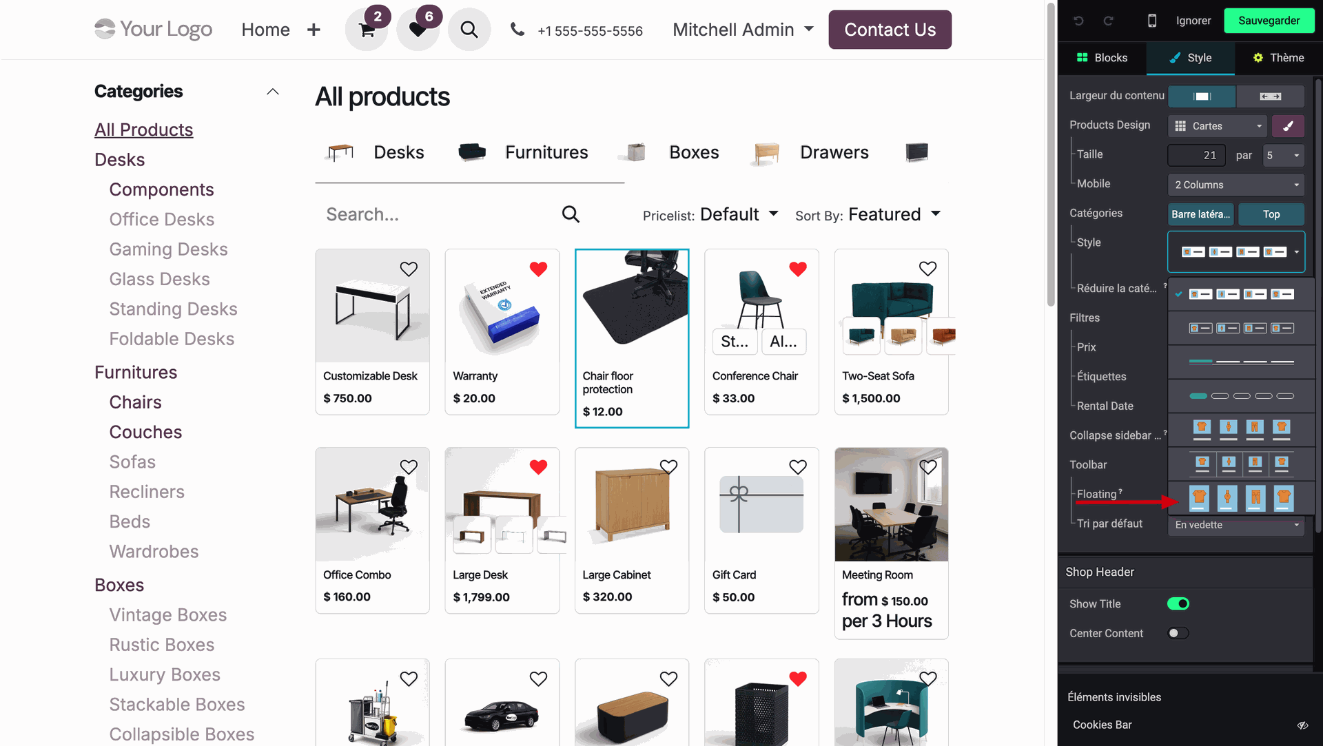 Une fois dans le menu d'édition, il va nous falloir sélectionner le block entier des produits. Puis se rendre dans l'onglet Style qui est disponible dans la fenêtre de droite pour personnaliser la disposition des onglets des catégories d'articles (dans notre exemple : Desks, Furnitures, Boxes...).