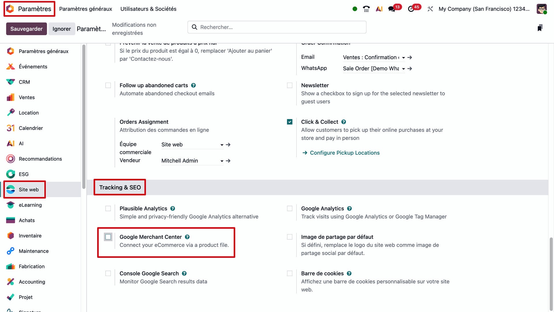 Mais pour bénéficier de cette nouveauté, il faut d'abord l'activer dans Odoo. Pour y parvenir, nous allons nous rendre dans les paramètres de l'application Site web et activer la fonctionnalité.