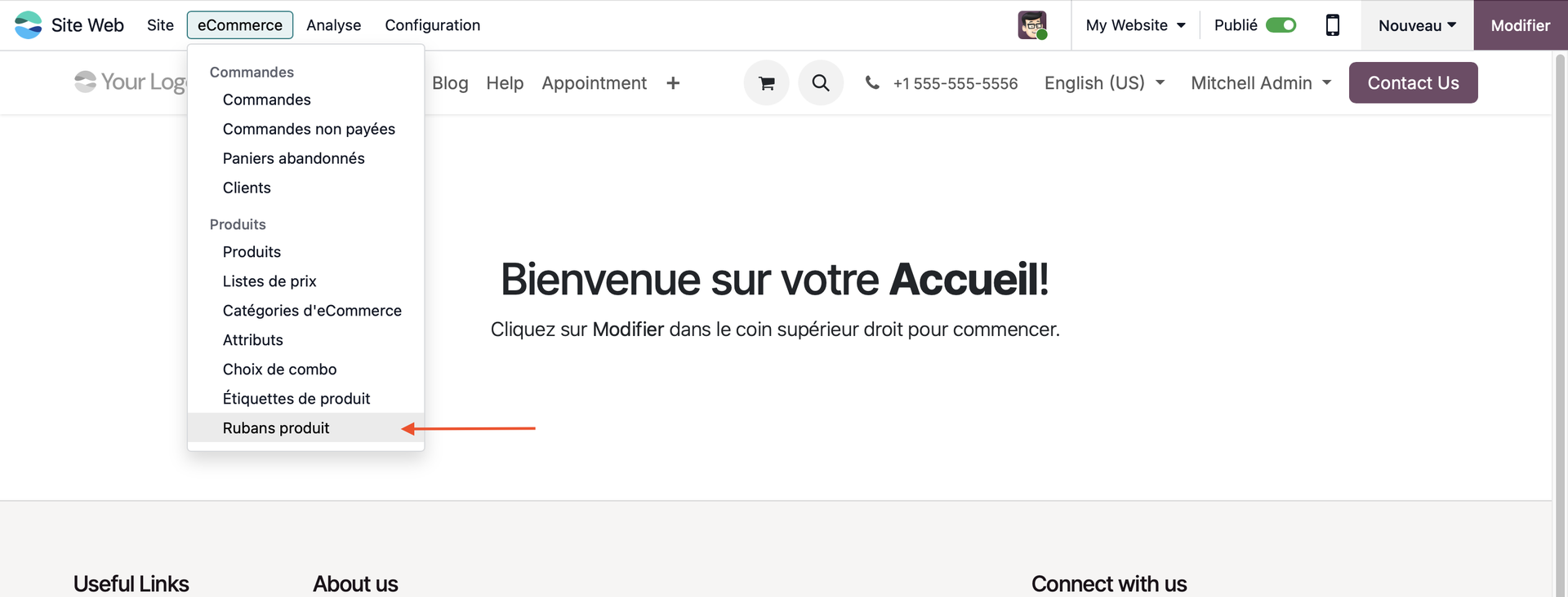 Ces rubans peuvent être créés dans l'application Site web, depuis le bouton eCommerce. En cliquant dessus il nous reste à sélectionner l'option Rubans produit.