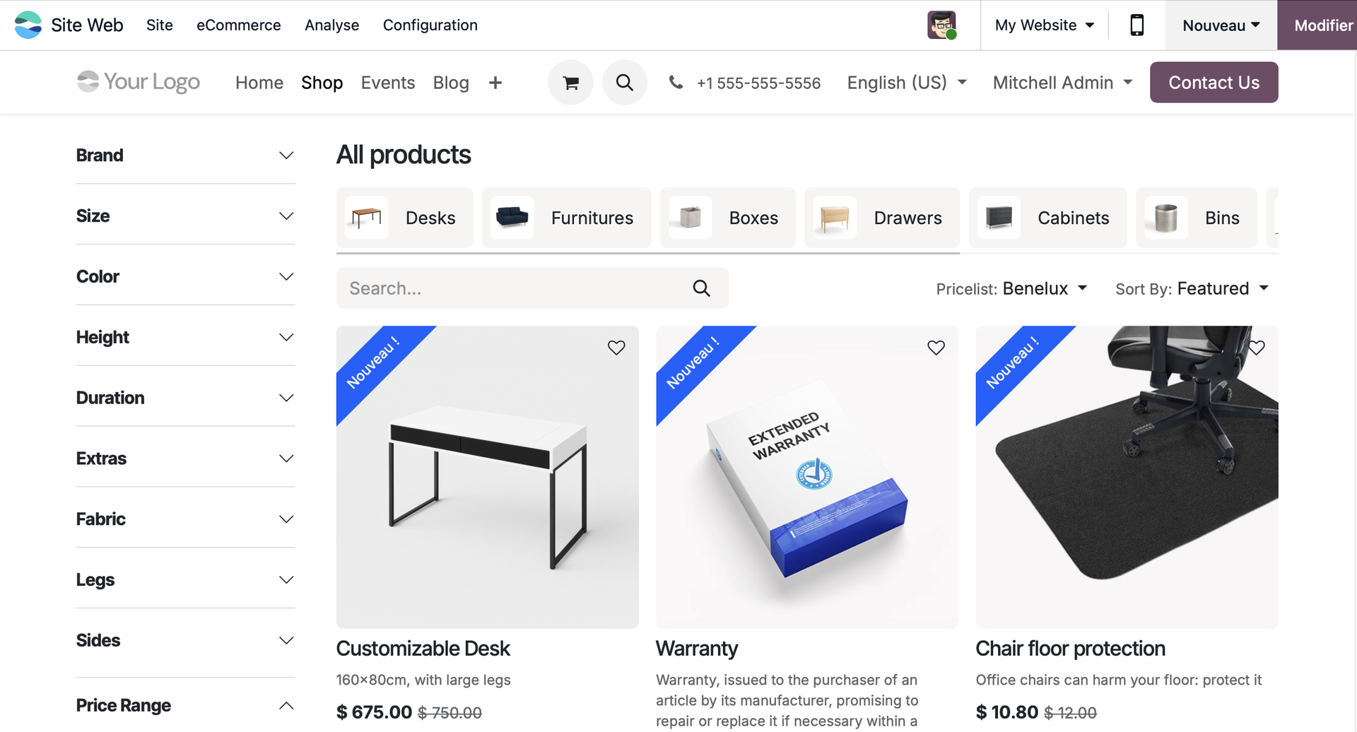 Un autre grand point fort d'Odoo est l'interconnectivité de ses différents modules. Le travail que vous aurez réalisé dans un module pourra être réexploité depuis un autre. Dans le cas du module Site web cela vous permettra d’afficher sur votre site internet les produits que vous aurez configurés depuis d'autres modules.
