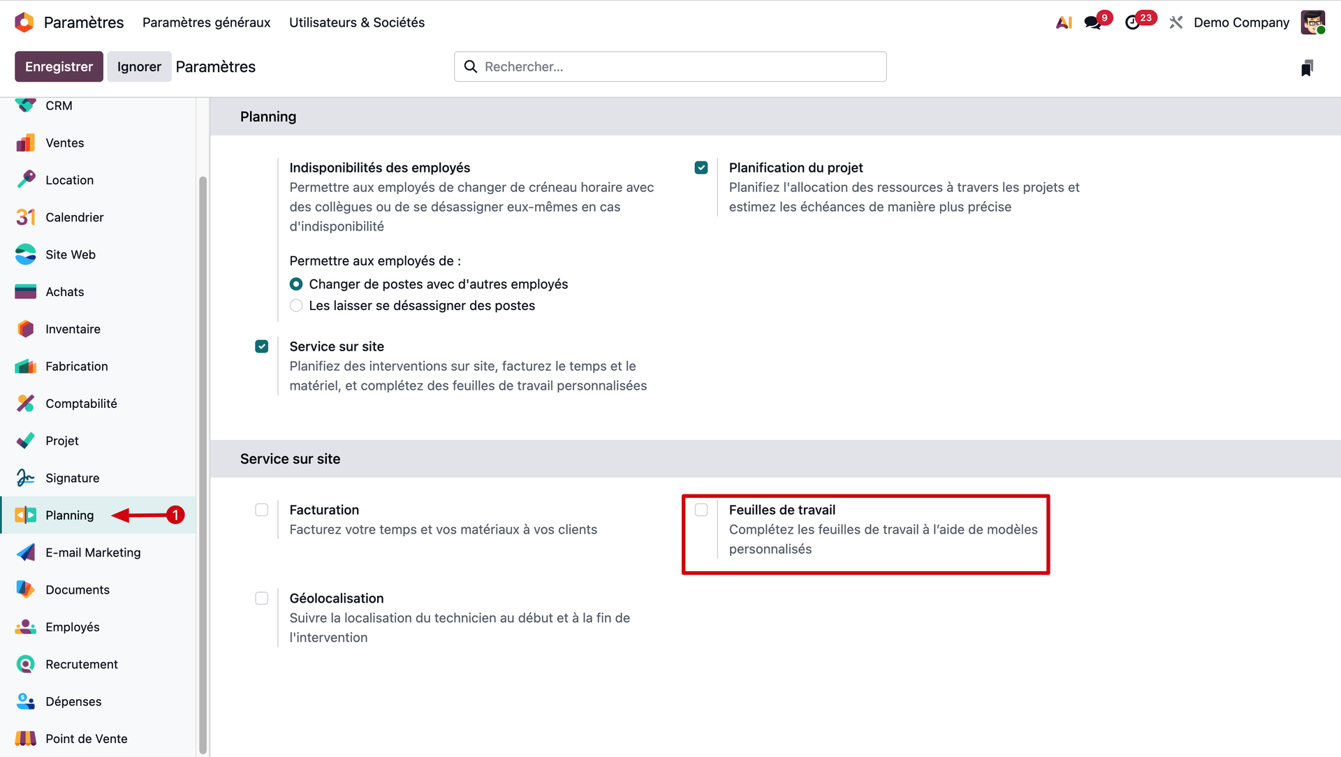 Tout d'abord, nous allons activer dans les paramètres Odoo les "Feuilles de travail" pour le module Planning, dans la sous-catégorie "Service sur site". Il nous suffit pour cela de cocher l'option, après nous être rendus dans le module "Paramètres" et la section dédiée au module "Planning".