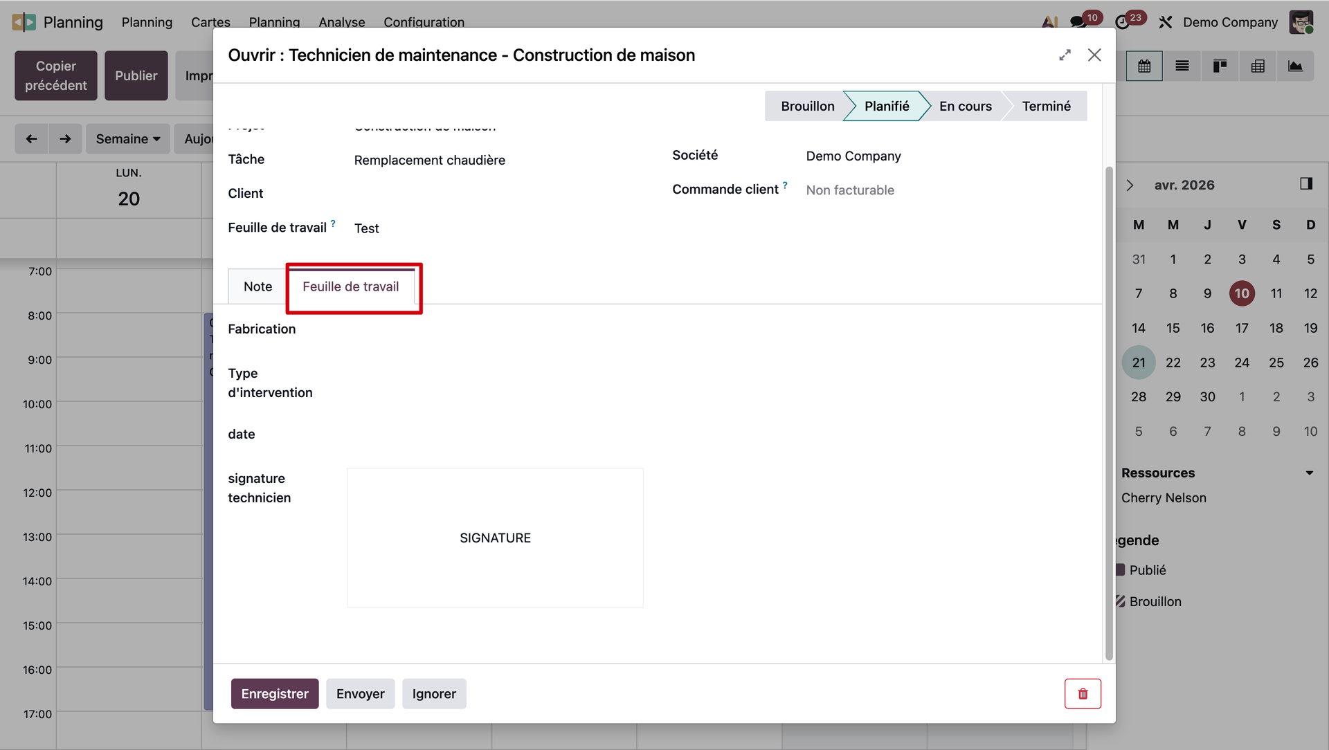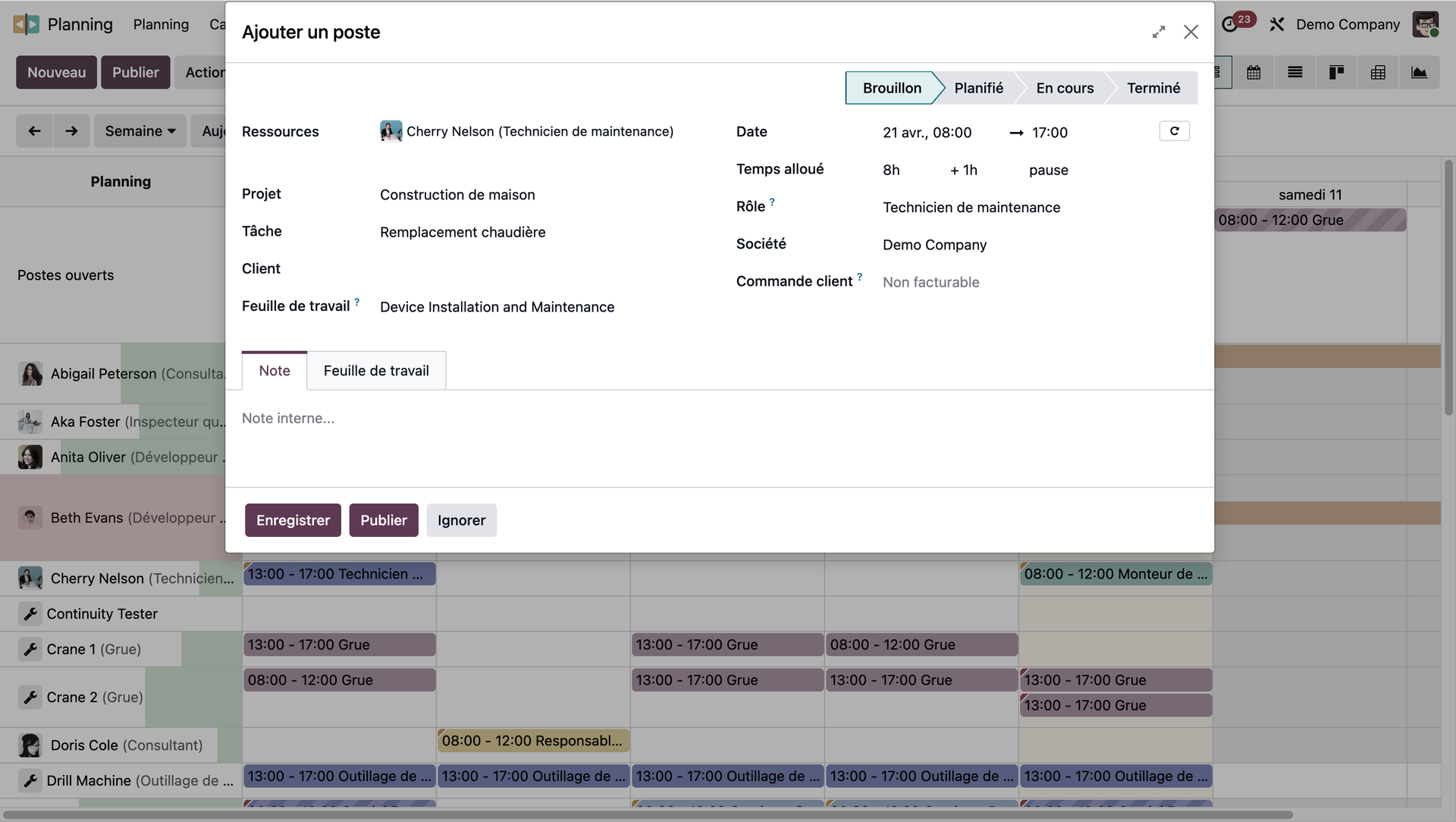 L’enchainement entre la planification temporelle et l'exécution des opérations est également renforcé. Directement depuis l'application Planning, les gestionnaires peuvent lier un créneau à une tâche de projet spécifique. Cela permet de passer instantanément de la vision "qui va où et quand" à la vision "quel est l'état d'avancement du travail".