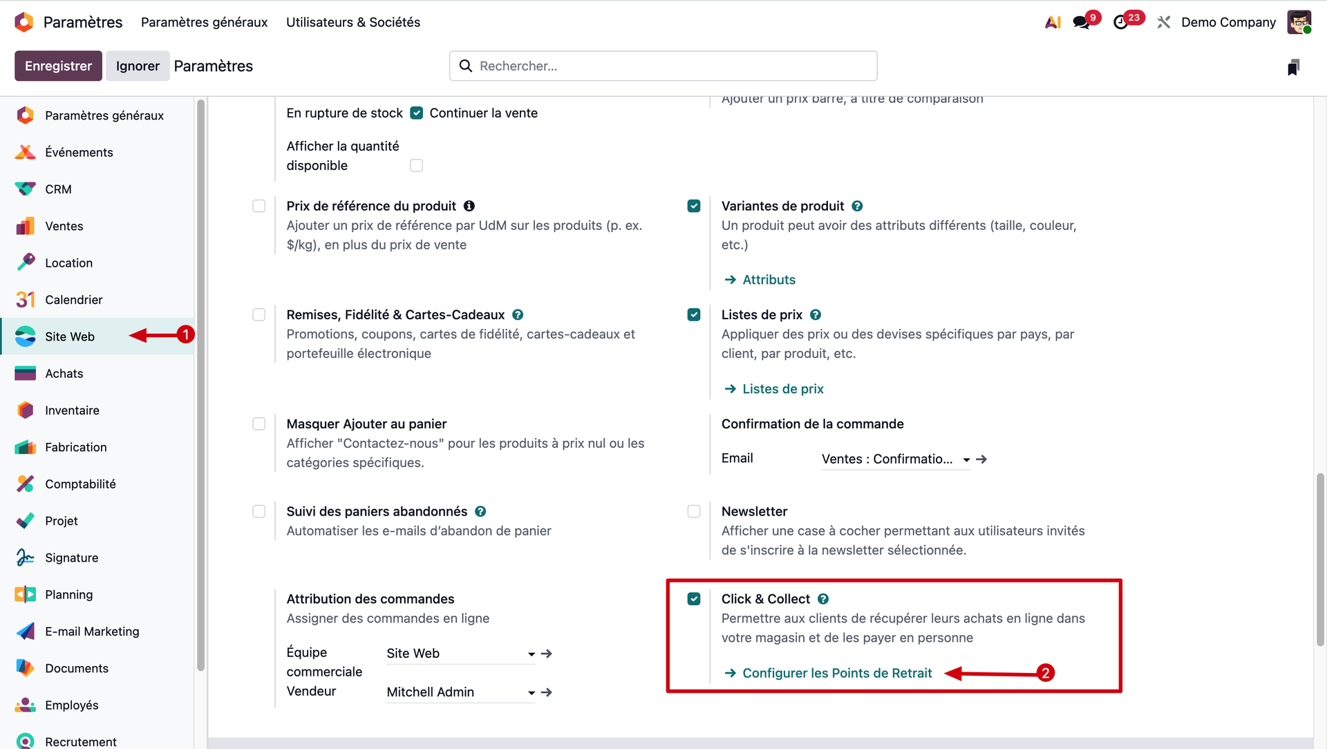 Depuis notre module Paramètres, nous recherchons dans la barre latérale gauche le module Site Web et cliquons dessus. Parmi les différentes options proposées, nous recherchons le point "Click & Collect". Nous veillons à ce que ce point soit bel et bien coché et cliquons sur le sous-point "Configurer les Points de Retrait".