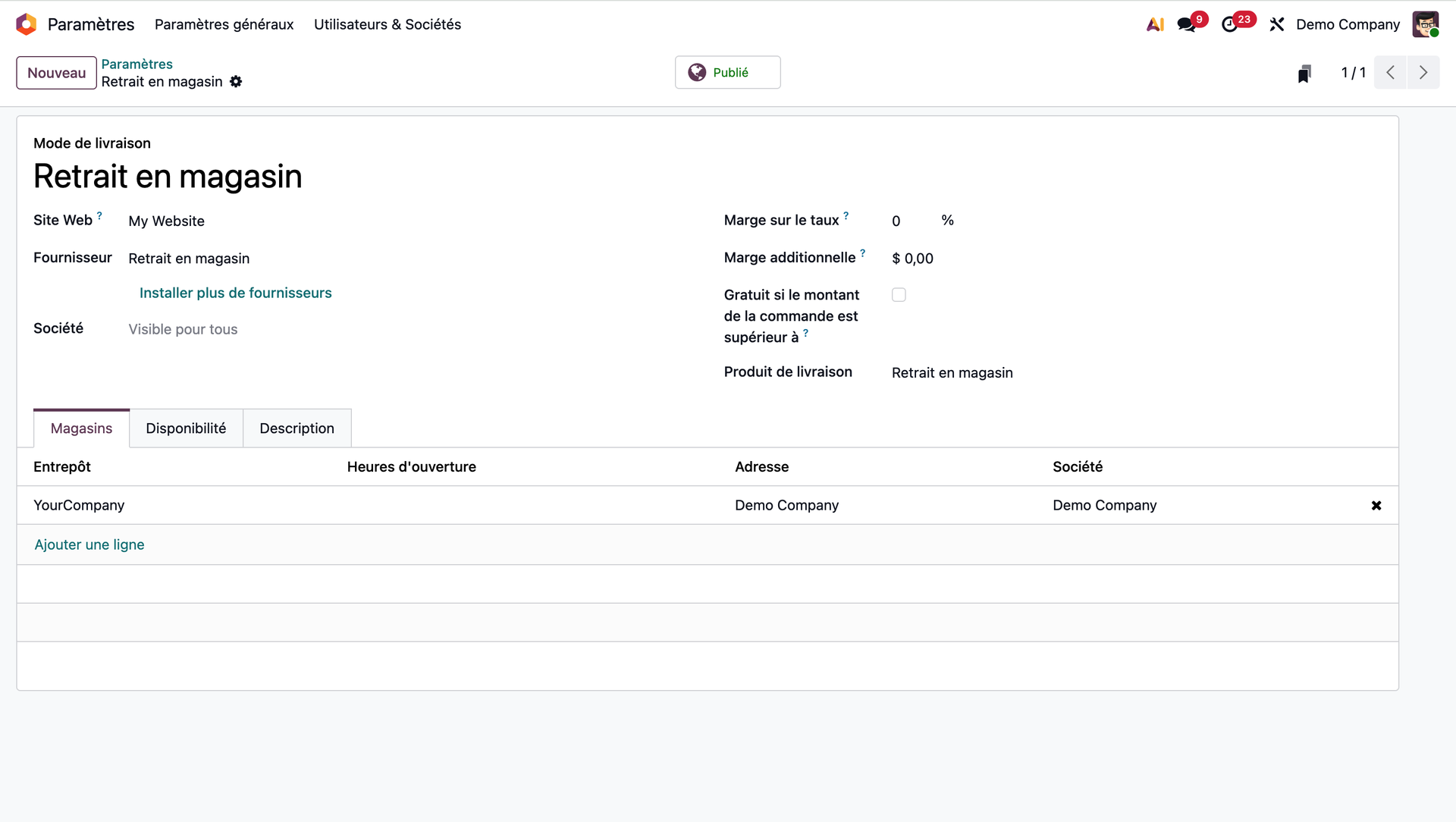 Il est désormais possible d'ajouter parmi les méthodes de livraison la méthode "Retrait en magasin"! Lorsque notre client préfère venir chercher son colis à son aise dans notre boutique plutôt que de camper chez lui en espérant intercepter le livreur... une option bien pratique! Voyons comment paramétrer cela dans notre Odoo.