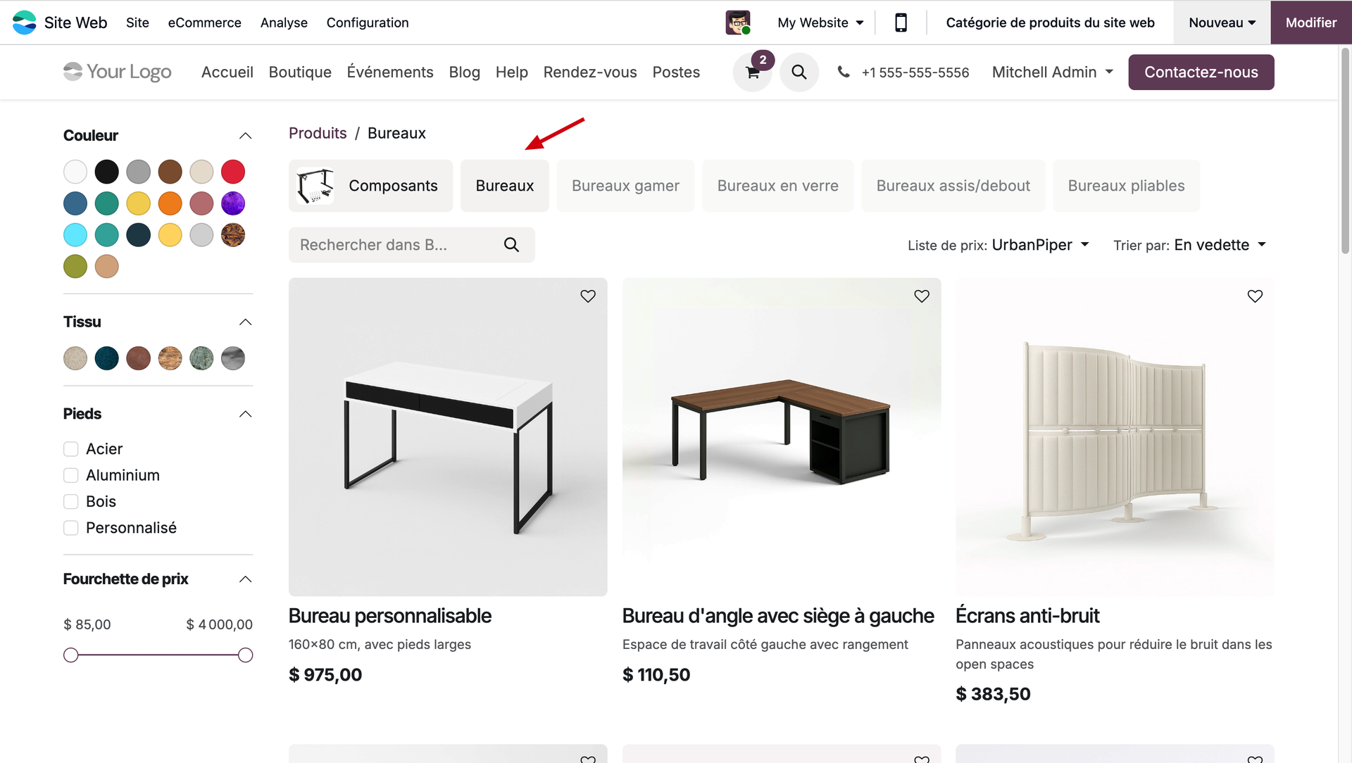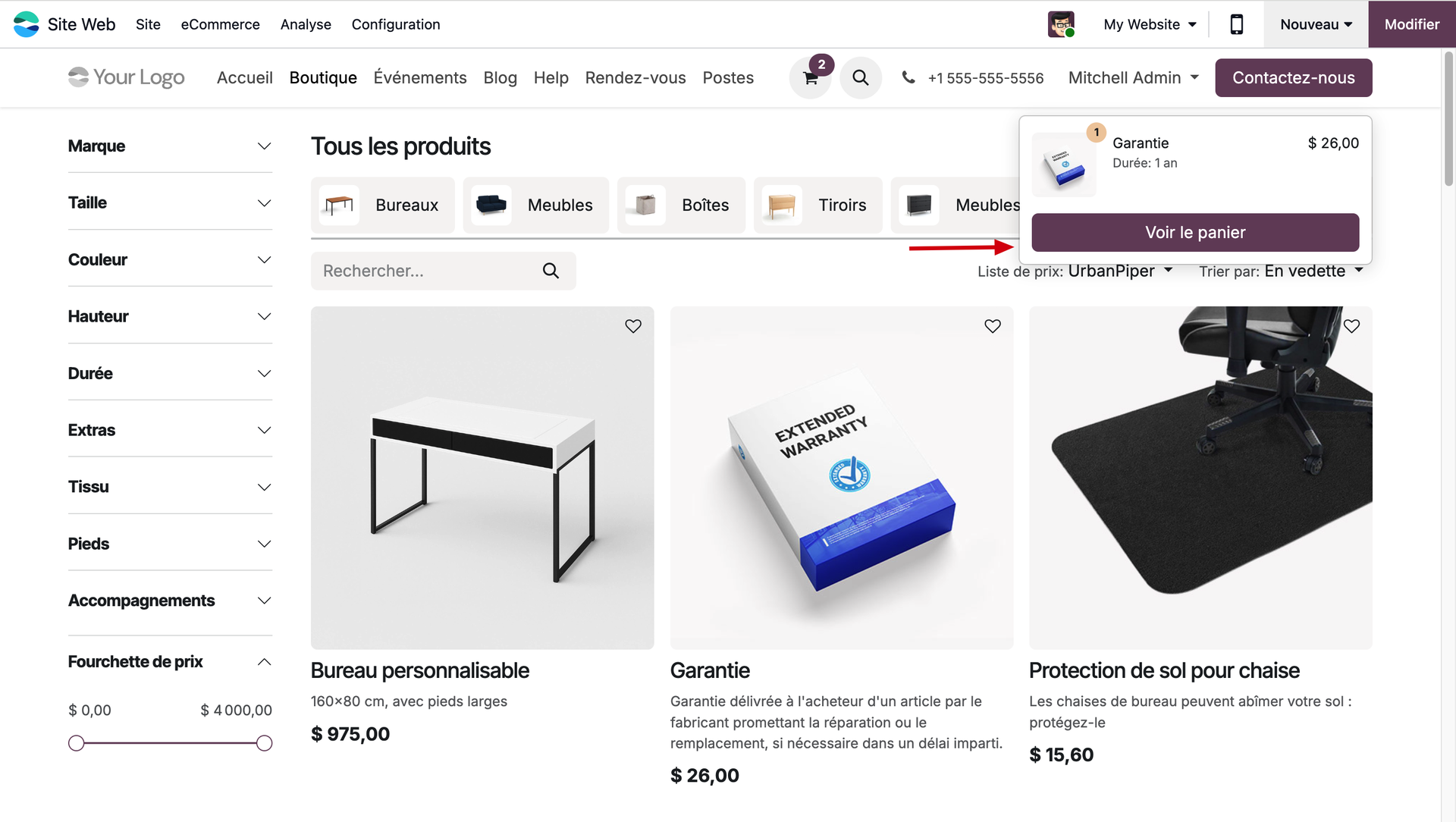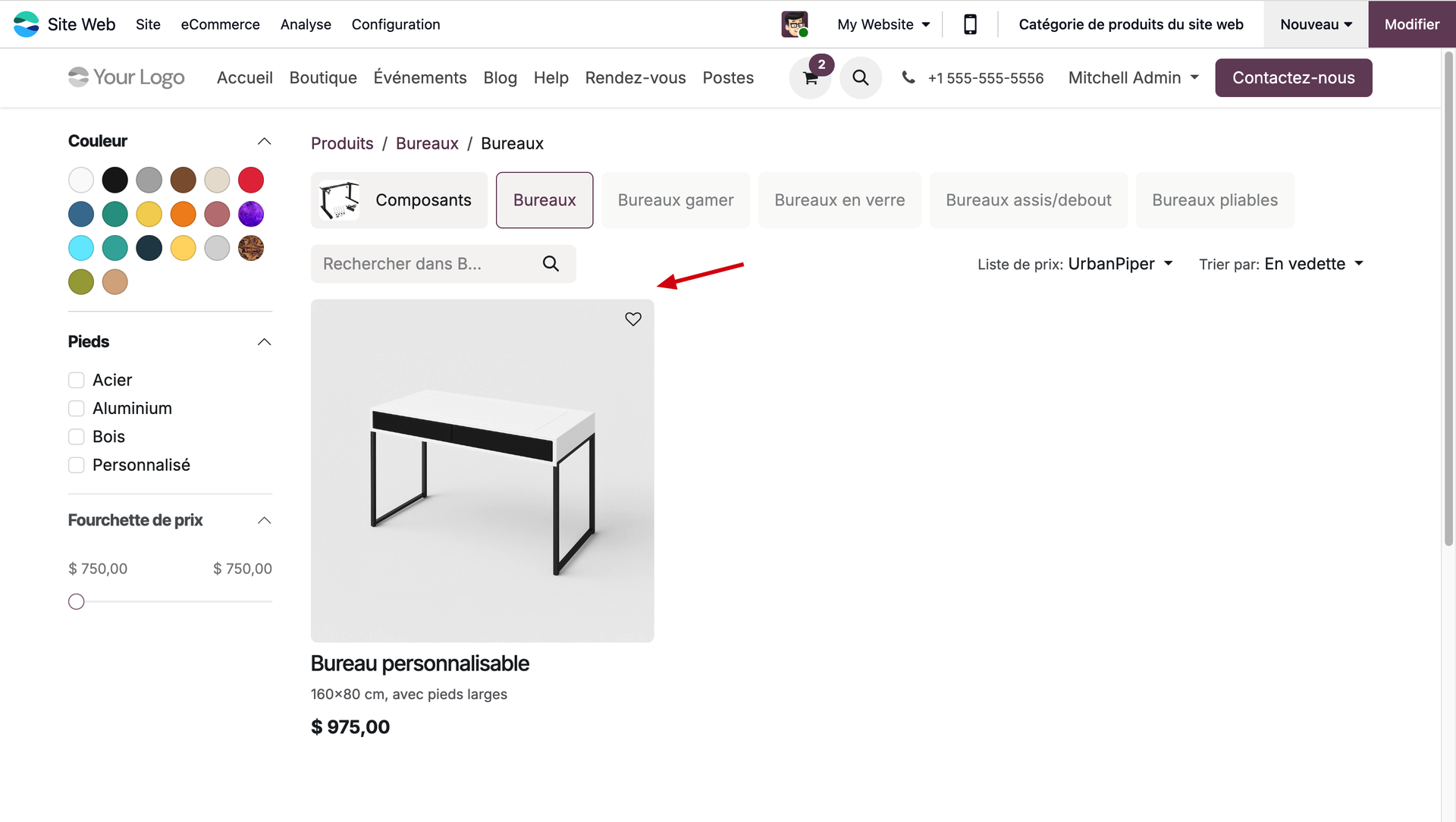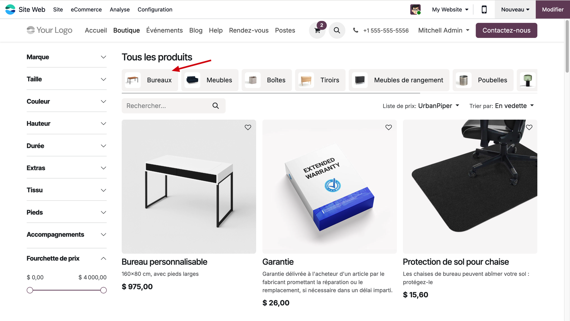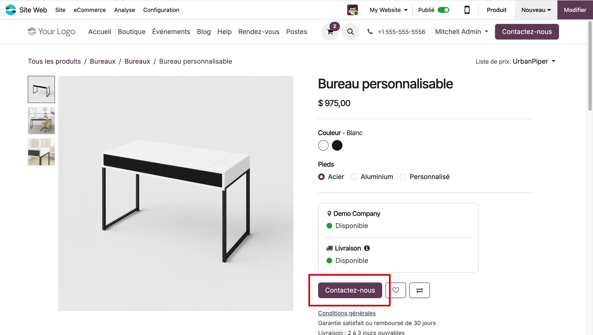 Dans notre exemple, nous allons faire en sorte que les clients nous contactent obligatoirement pour tout achat appartenant à la catégorie des bureaux. Vérifions si notre paramétrage a bien fonctionné en nous mettant dans la peau de notre client.