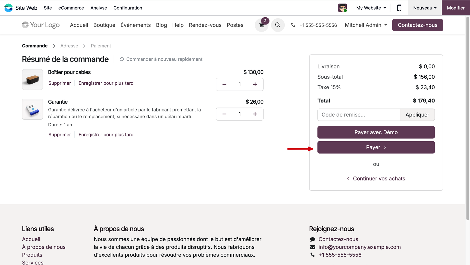 Une fois dans notre panier, nous cliquons sur le bouton "Payer" pour régler.