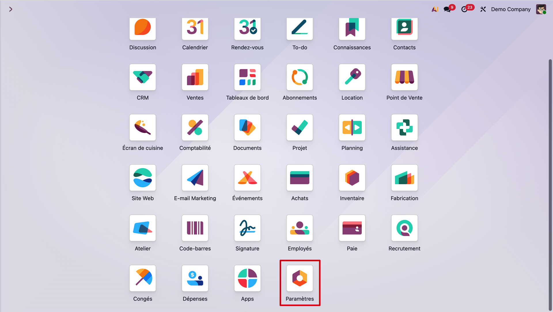 Pour la première étape, rendez-vous dans le module Paramètres d'Odoo depuis notre tableau de bord des applications.