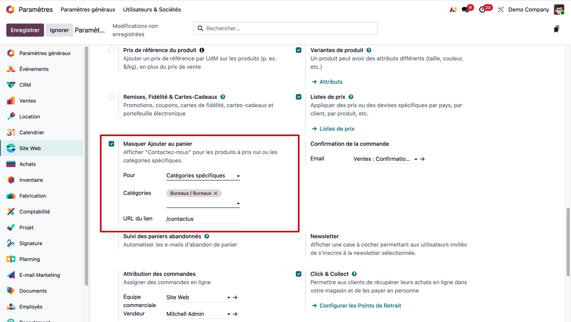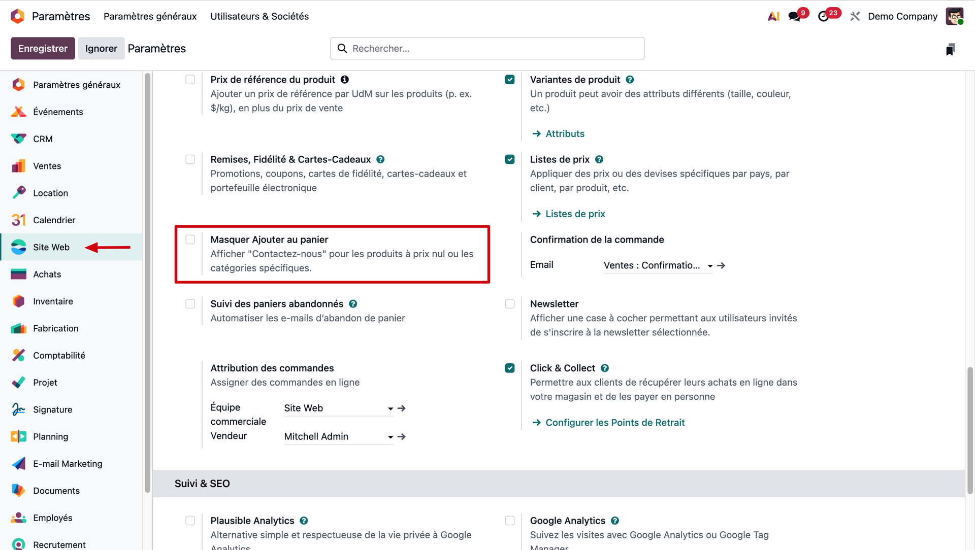 Depuis ce module, nous cliquons dans l'option "Site Web" de notre barre latérale. Et puis nous cochons la case "Masquer Ajouter au panier".