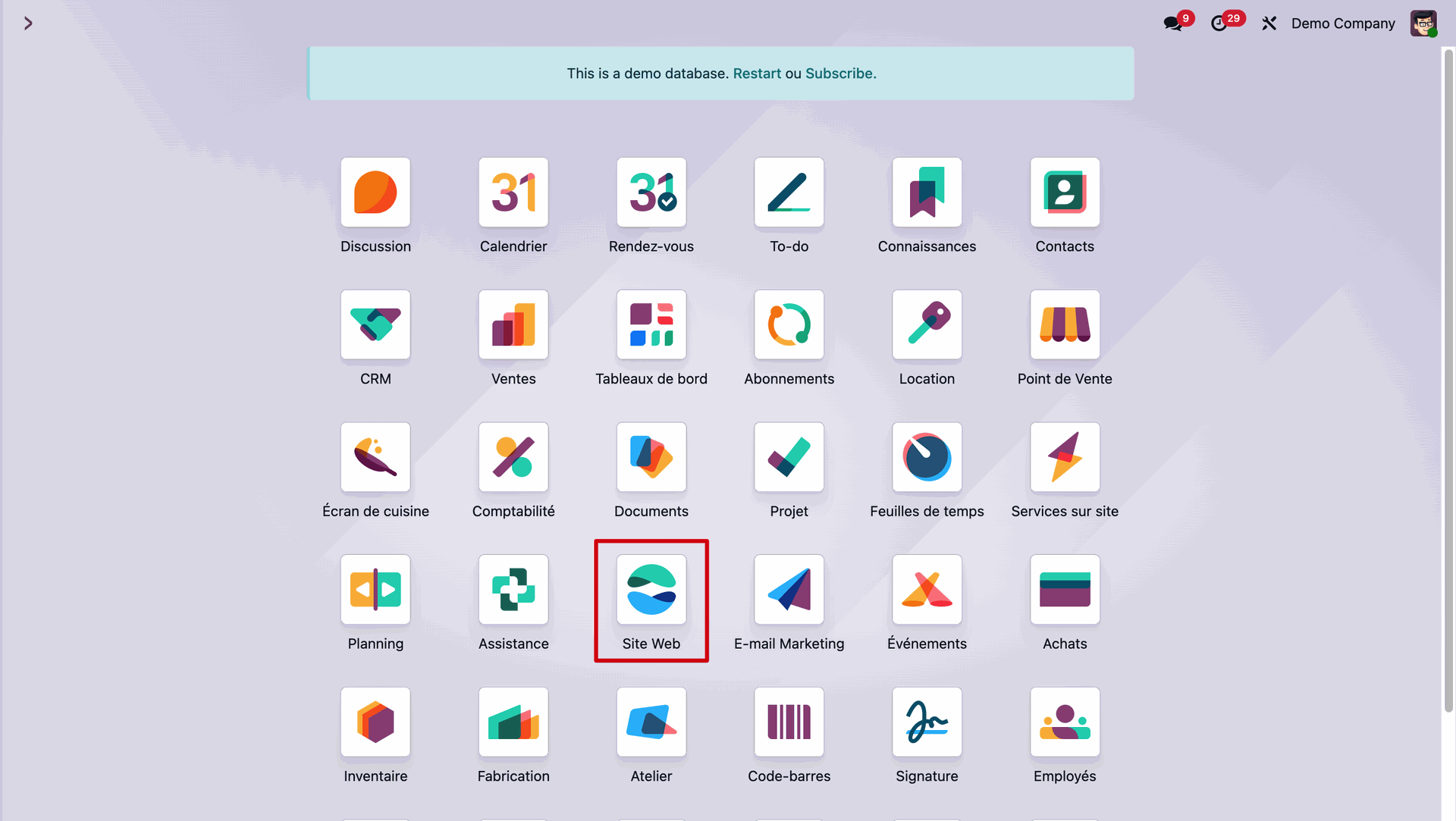 Parcourons le module Site web pour analyser son fonctionnement et les nouveautés dont Odoo 19 lui a fait cadeau ! Nous allons commencer par ouvrir le module depuis notre tableau de bord des applications.