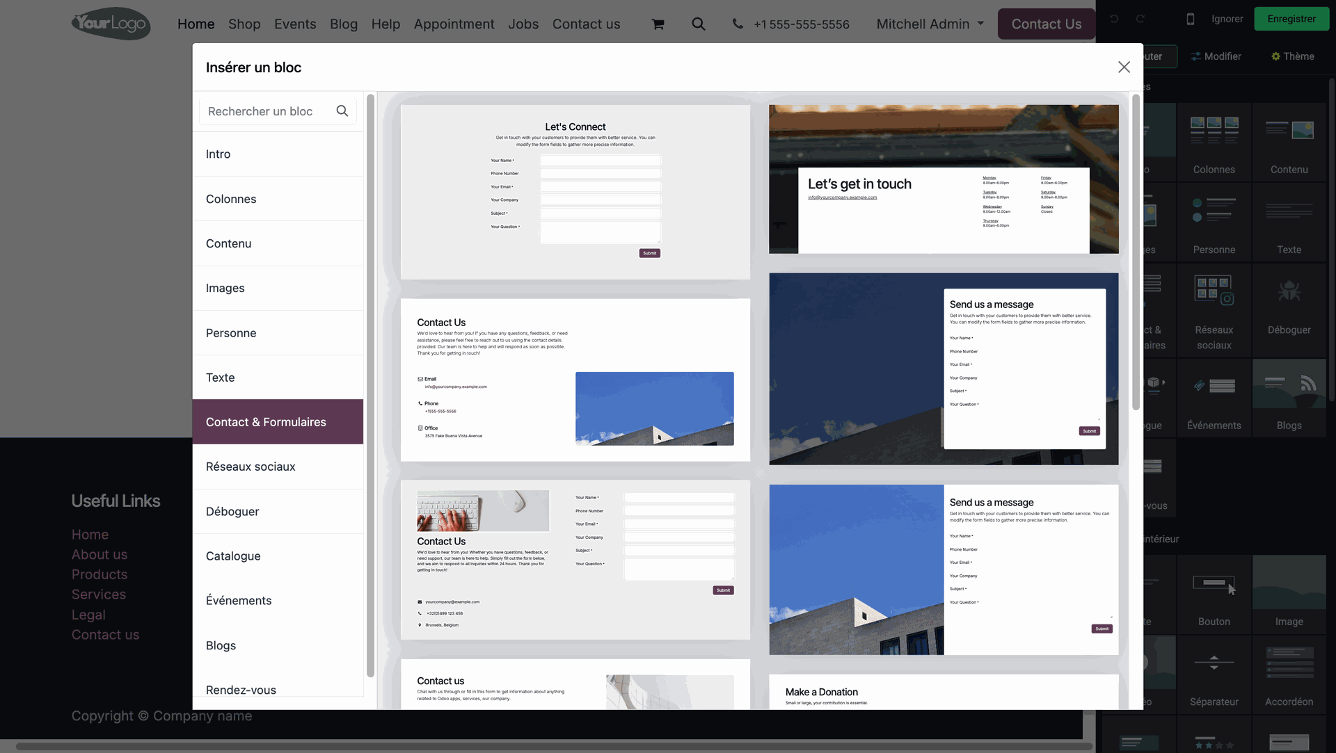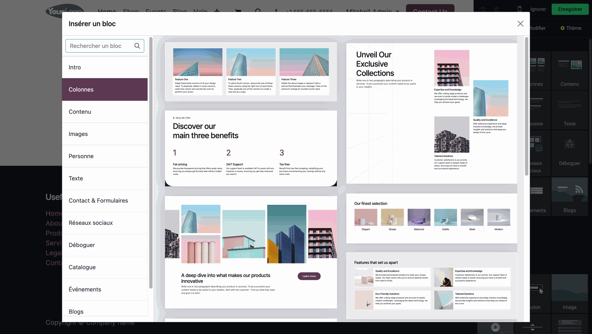 L'un des plus grands points forts d'Odoo est la fluidité de sa prise en main (vous en conviendrez, n'est-ce pas ?). Les différents postes qui auraient pu nécessiter des connaissances en développement pour un rendu satisfaisant de votre création sont simplifiés à l'aide des modules Odoo. Ces modules fonctionnent avec un catalogue de modèles à réadapter à votre guise et un système de blocs à placer et déplacer où bon vous semble.