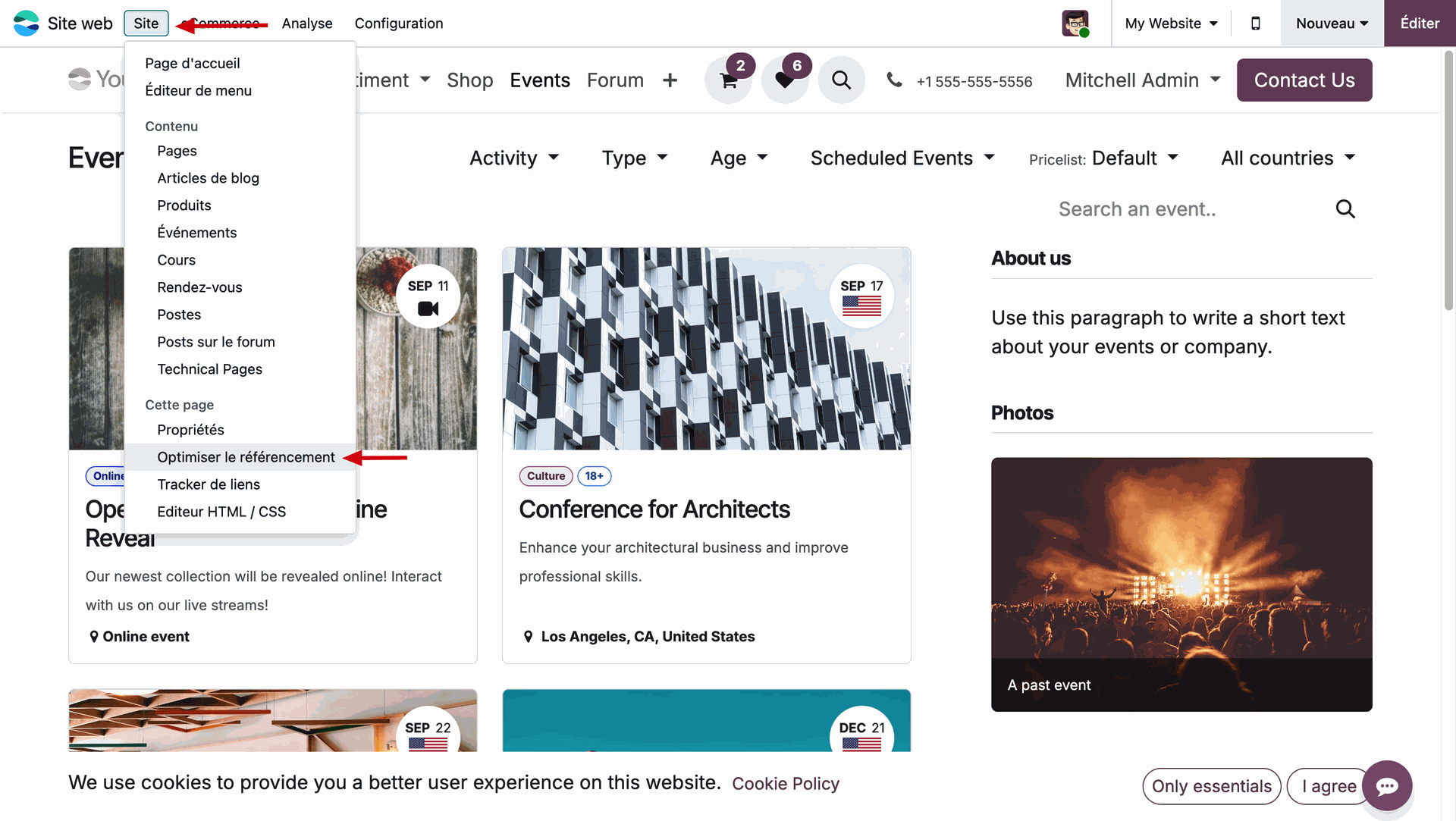 Et, si nous allions jeter un œil dans la section Référencement d'Odoo ? Pour cela il faut observer les boutons dans le coin supérieur gauche de notre écran, l'un d'eux s'appelle Site. Lorsque l'on clique dessus, un menu contextuel apparaît. Il suffit alors de cliquer sur Optimiser le référencement. Une fenêtre s'ouvre ensuite ...