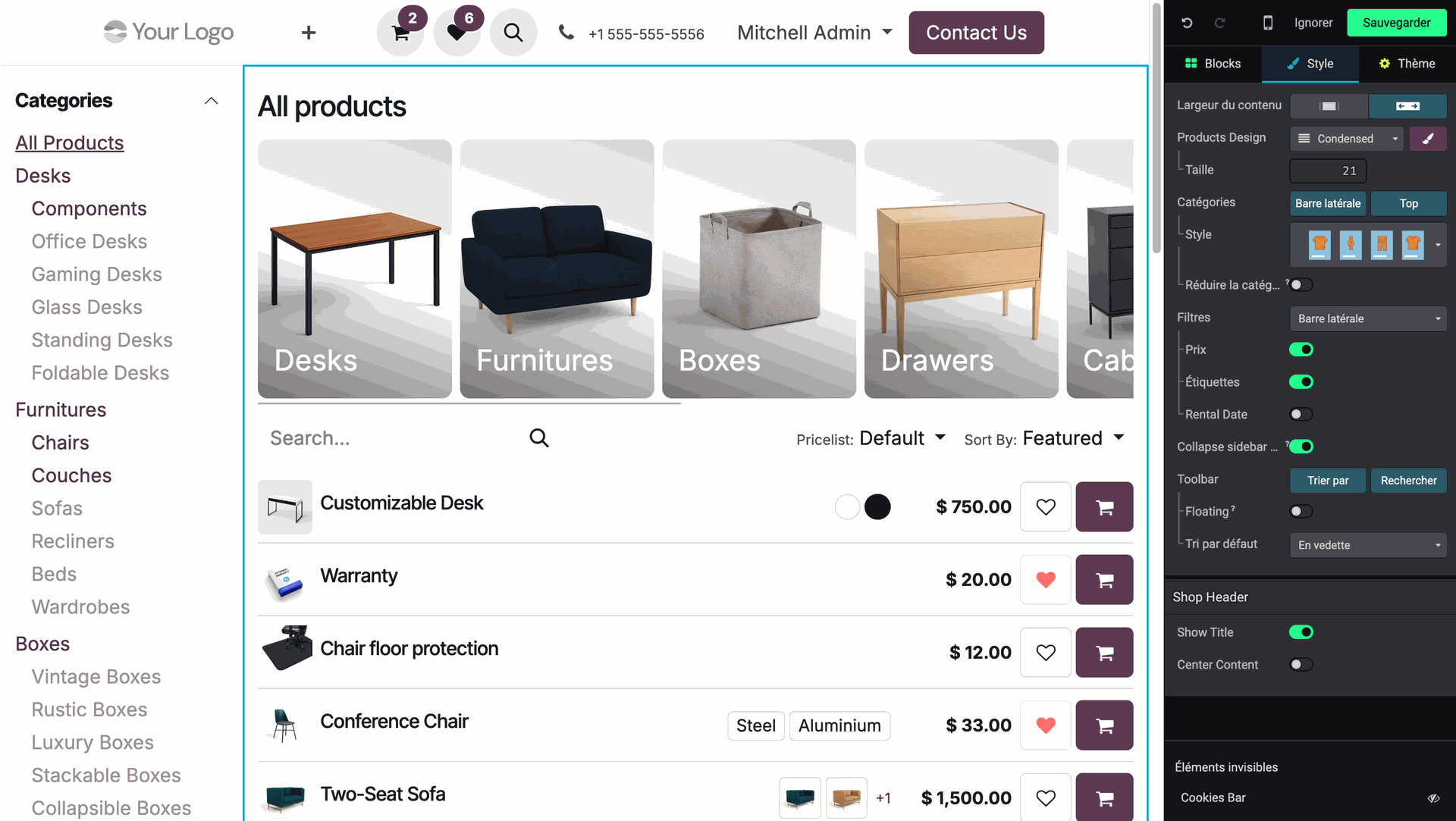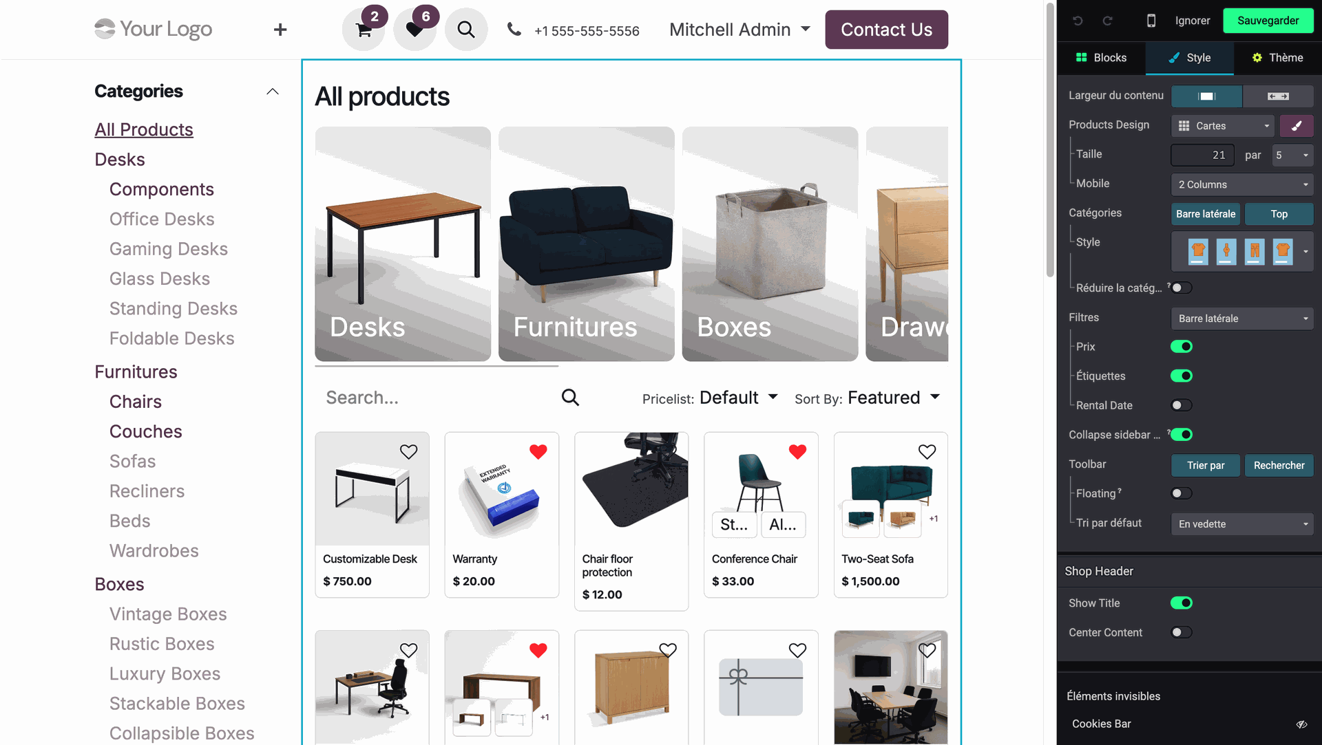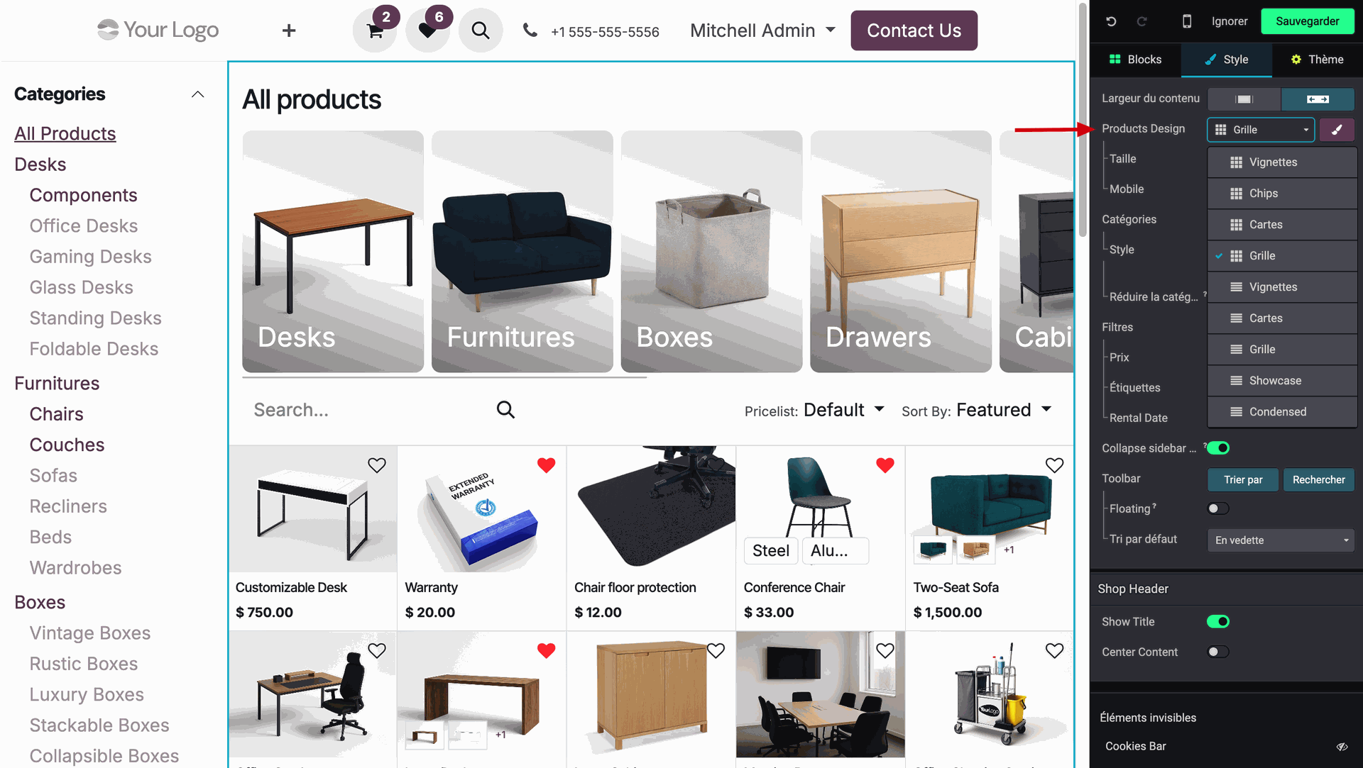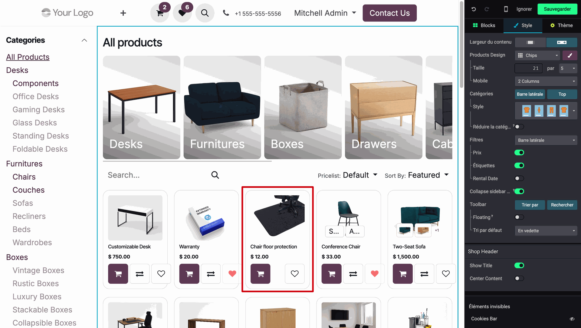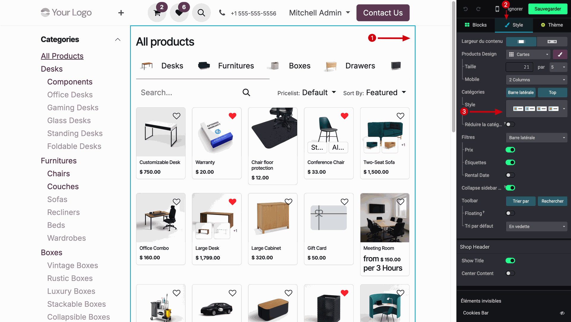 Une fois dans le menu d'édition, il va nous falloir sélectionner le block entier des produits. Puis se rendre dans l'onglet Style qui est disponible dans la fenêtre de droite pour personnaliser la disposition des onglets des catégories d'articles (dans notre exemple : Desks, Furnitures, Boxes...).
