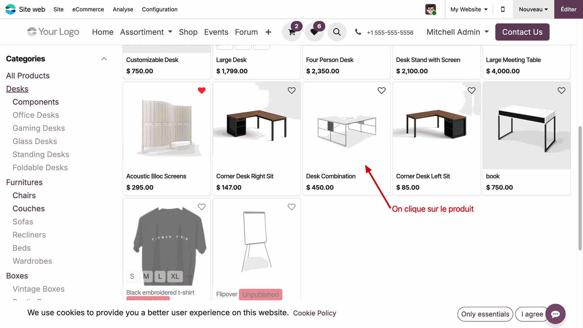 Un autre grand point fort d'Odoo est l'interconnectivité de ses différents modules. Le travail que vous aurez réalisé dans un module pourra être réexploité depuis un autre. Dans le cas du module Site web cela vous permettra d’afficher sur votre site internet les produits que vous aurez configurés depuis d'autres modules.