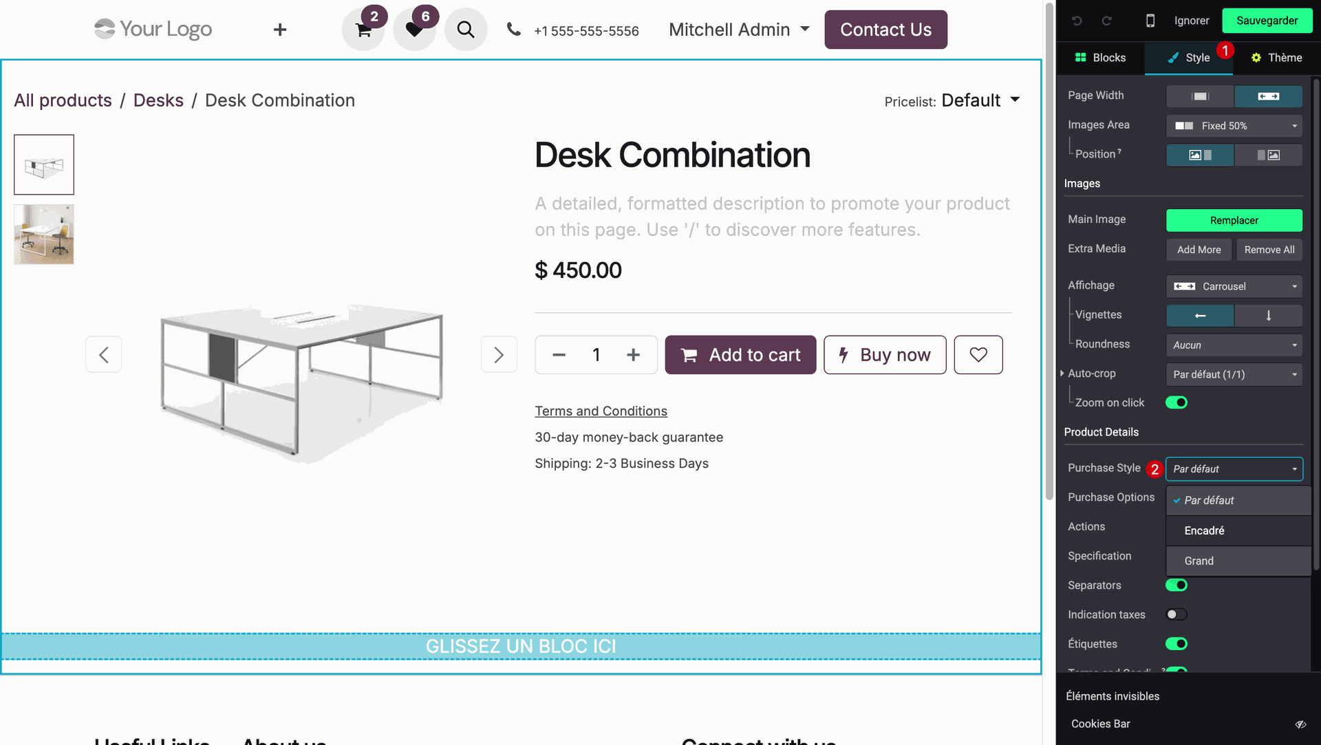 Cela nous permet "d'entrer" dans la fiche produit et d'opérer le même type de modifications de mise en page que pour nos listes d'articles un peu plus tôt. Nous nous rendons une nouvelle fois dans l'onglet Style dans la fenêtre de droite et il ne nous reste plus qu'à sélectionner le paramètre Style d'achat de notre choix à appliquer !