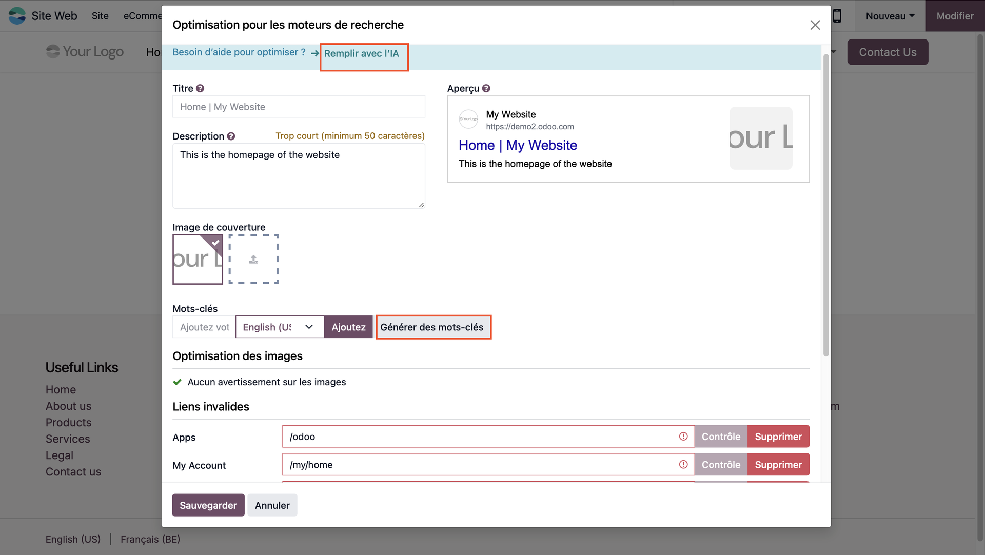 Odoo 19 va aussi effectuer des contrôles automatiques. Pour développer avec un exemple : si votre site web n’a pas de balise H1 ou si une image n’a pas de balise alt tag, Odoo 19 le détectera immédiatement. Mais que fait-il de ce constat au juste ? Voyons cela ...