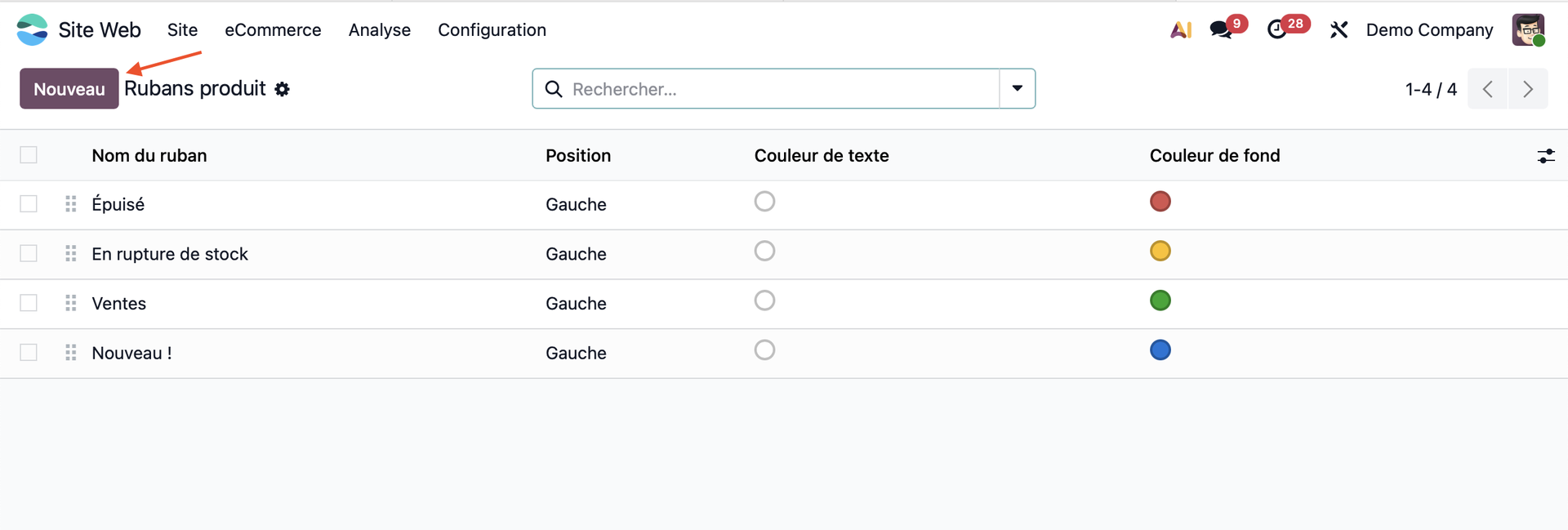Nous allons ensuite avoir une page dédiée à la gestion des rubans de produits, en créer un nouveau à l'aide du bouton Nouveau.