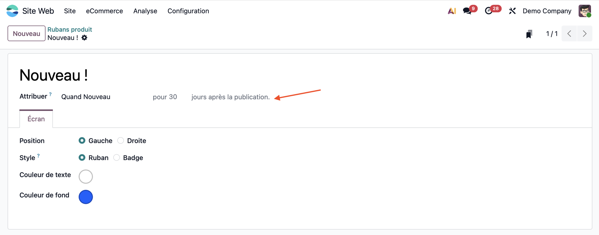 Voici un exemple d'utilisation des rubans. Nous pouvons voir que l'on assigne ce ruban au produit automatiquement quand il est nouveau sur le site web (pour une durée de trente jours).