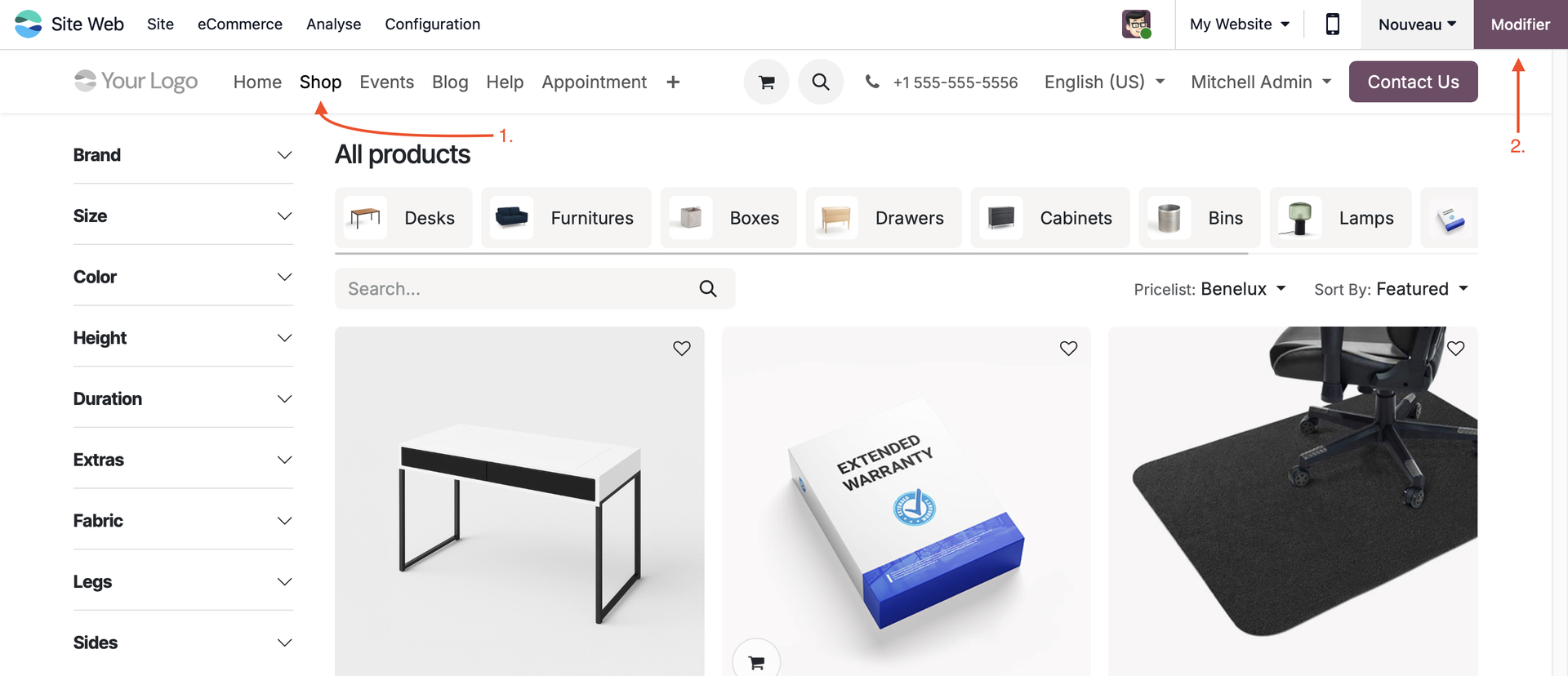 Pour voir cela de plus près nous allons nous rendre dans l'application Site web et puis dans l'onglet Shop. Cela nous permet d'atterrir sur le listing de nos produits pour mieux éditer leurs fiches ! Pour l'édition, nous allons cliquer sur le bouton Éditer dans le coin supérieur droit de notre écran.