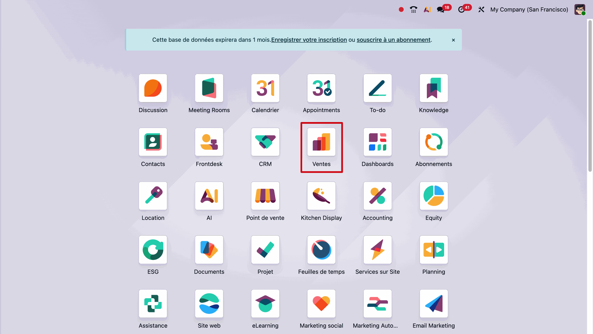 Pour commencer notre démonstration nous allons nous rendre dans le module Ventes depuis votre tableau de bord d'applications :