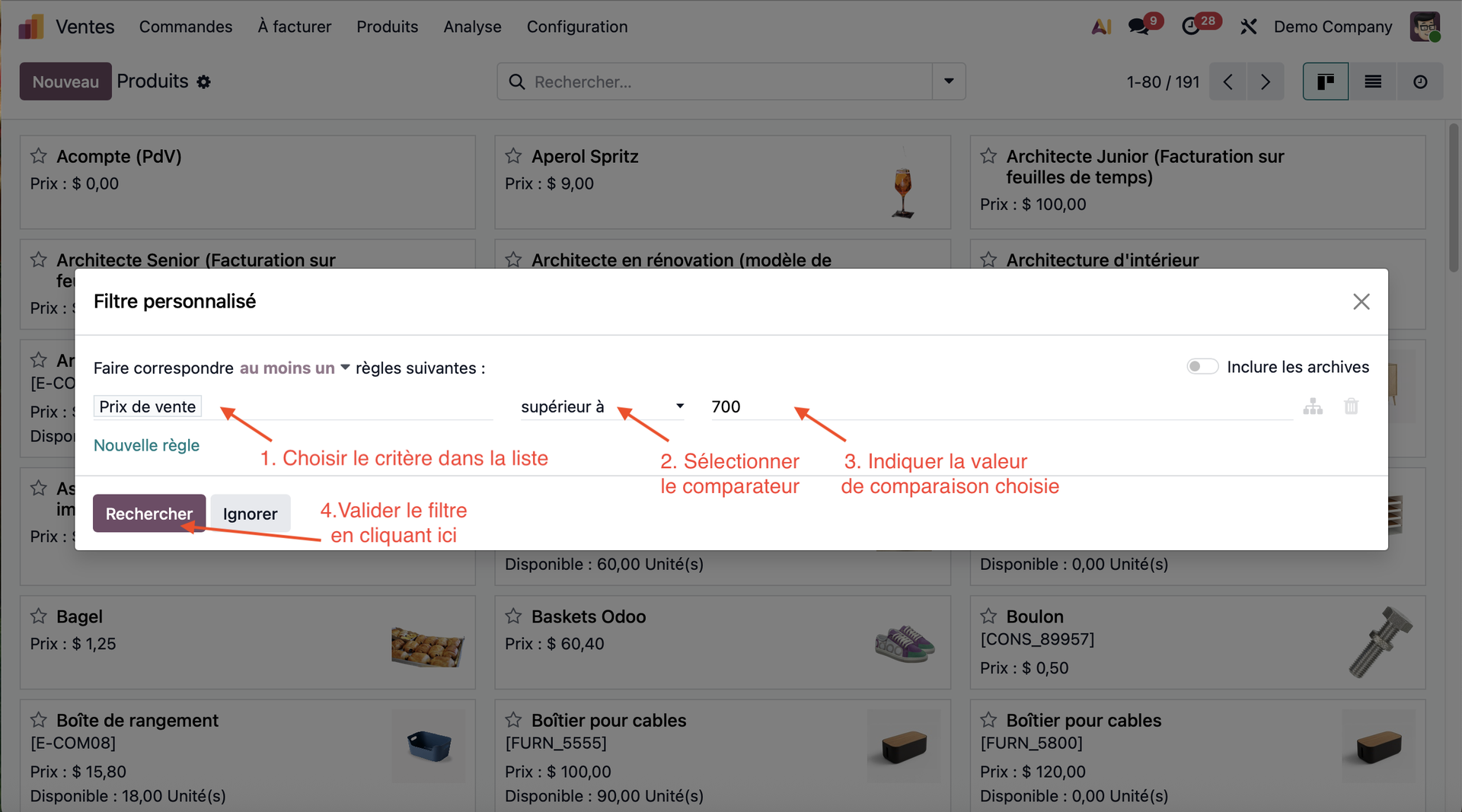 Notre objectif aujourd'hui va être d'augmenter de cinq pourcents tous les articles d'une valeur strictement supérieure à sept cents euros. Depuis le module Ventes, nous allons pouvoir filtrer nos produits.